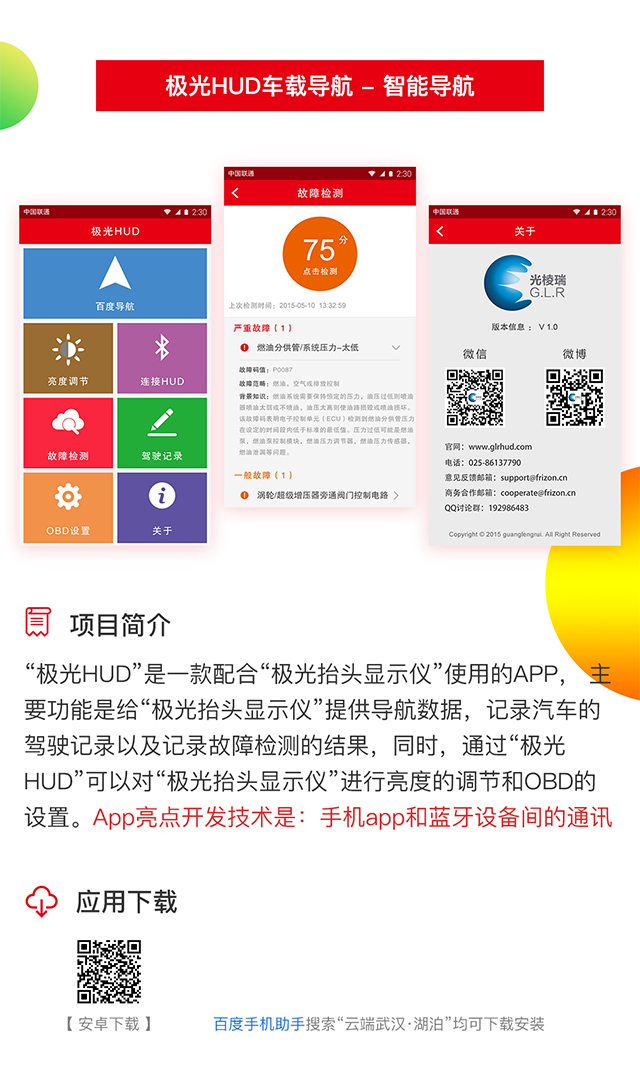 “极光HUD”是一款配合“极光抬头显示仪”使用的APP, 主要功能是给“极光抬头显示仪”提供导航数据,记录汽车的驾驶记录以及记录故障检测的结果,